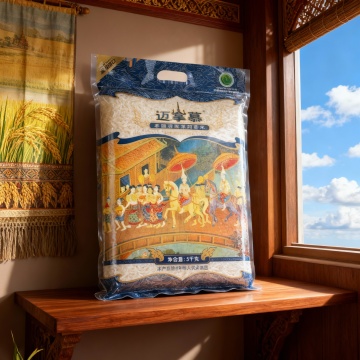 高清写实风格的大米摄影,画面中散落着晶莹饱满的白色米粒,两个浅棕色木质方形米盒内装满圆润洁白的大米,盒边装饰着数支金黄成熟的稻穗,背景是编织纹理的深绿色布艺,整体色调以米白、浅棕、金黄和墨绿为主,光线柔和从斜上方洒落,米粒表面泛着细腻光泽,稻穗呈现自然弯曲形态,木质米盒有精致的拼接纹路,营造出质朴、纯净、原生态的温馨氛围,突出大米的天然质感与丰收的喜悦。