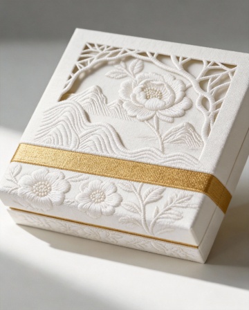白金双色礼盒,融合中式刺绣与浮雕工艺,重拟物纹理呈现山花意境,简约中透出奢华优雅。