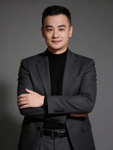 商务感十足的实景肖像,采用性冷淡风与单色设计,金属质感光影强化立体层次,呈现专业沉稳的视觉氛围。