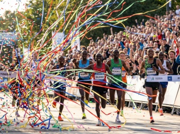 清晨冷色调光线,柔和的蓝色与紫色晨曦,低角度光源从侧面照射,前景跑步者的腿部肌肉与白色运动鞋有清晰的明暗交界线,地面呈现蓝紫色调反光,背景模糊的马拉松人群笼罩在朦胧的冷色晨光中,整体画面保持逆光拍摄的层次感,前景清晰聚焦于迈开的双腿和跑鞋,背景人物呈现剪影效果,冷色调光线营造出清新而充满活力的晨跑氛围,写实摄影风格,高对比度,细腻的皮肤纹理与跑鞋细节,柏油路面的颗粒质感在冷光下清晰可见。