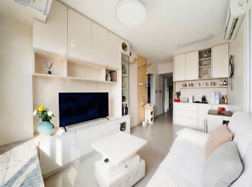 极简主义风格室内客厅,浅灰色布艺沙发搭配同色系靠垫,线条简洁的金属框架圆形小茶几,浅米色条纹地毯铺于大面积浅灰色瓷砖地面,落地窗前垂挂白色纱帘,自然光柔和洒入营造明亮通透氛围,墙面简洁无装饰仅设窄边置物架,整体色调以灰白为基础,空间布局开阔留白充足,设计感十足,呈现简约高级的现代家居美学。