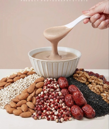 一张富有创意的商业产品摄影图,纯正俯视视角,画面左半部分,呈半扇形地摆放着8种天然食材,有赤小豆、薏苡仁、燕麦片、莲子、芡实、茯苓、新鲜的山药片、橘皮。画面光线明亮柔和,色彩自然,食材的质感真实,构图干净且富有设计感,高清细节,背景方便抠图