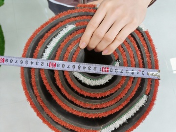 一只毛刷正在抛光一块透明玻璃,毛刷的刷毛清晰可见,玻璃表面有细微的反光和光泽,背景简洁,突出主体动作