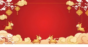 国潮风插画,红马奔腾,鎏金祥云与灯笼点缀,剪纸元素融合中式纹样,喜庆吉祥,尽显民族韵味。