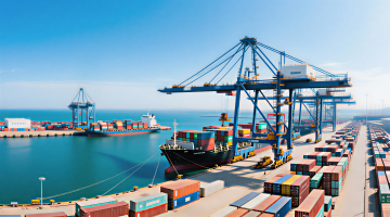 一艘大型集装箱货轮的平面矢量图标,船体和集装箱呈现出从深绿色到浅绿色的渐变效果,船头下方有波浪线条装饰,整体设计简洁现代,轮廓清晰,白色背景,风格为简约的商业标识设计。