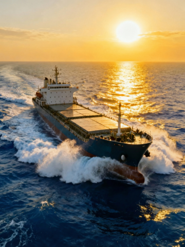 正面视角的大型货轮航行在蔚蓝海面上,船头撞开白色浪花,船身装载着红、黄、蓝、绿彩色集装箱,天空中飘着蓬松白云和飞翔的海鸥,采用扁平化插画风格,色彩明快饱和,线条简洁流畅,海浪呈现规律的波纹纹理,整体画面充满航海的活力与自由氛围。