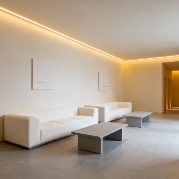 现代高端中式餐厅包间场景,深灰色圆形餐桌铺着质感细腻的深色桌布,摆放着精致的白色瓷盘、红色筷子、透明高脚杯和小巧的金色装饰球,周围环绕着黑色皮质餐椅,背景是深色墙面与带有横向线条的木质隔断,顶部柔和的嵌入式暖光照明营造出静谧优雅的氛围,整体风格简约奢华,色调以黑、灰、深棕为主,光影层次分明,展现出高级餐饮空间的精致与格调。