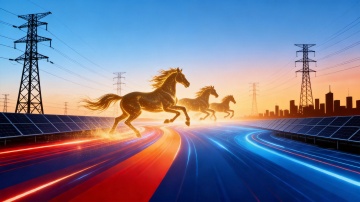 霓虹灯风与描边风交织,火焰骏马奔腾于红色虚拟自然中,光影流动,粒子飞舞,营造出喜庆梦幻的春节氛围。