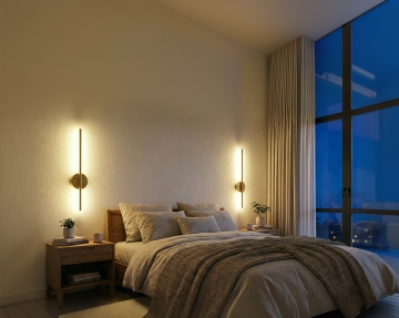 极简主义风格卧室室内设计,柔和的米白色墙壁与浅橡木色木地板形成温暖和谐的基调,大尺寸窗户覆盖木质百叶帘,阳光透过百叶帘在墙面和地面投射出清晰的水平条状光影,营造出宁静舒适的氛围。房间中央放置一张低矮的原木色双人床,搭配白色床单和一条深棕色的床尾毯,床头墙悬挂一幅带细木边框的空白装饰画。床的一侧有一盆小型绿植放置在矮木架上,另一侧摆放着带有干枯树枝装饰的细长花瓶。地面铺设大块浅色毛绒地毯,天花板安装嵌入式筒灯提供均匀基础照明。整体采用简约自然的材质,线条干净利落,空间通透开阔,呈现出日式侘寂美学与现代简约设计的融合感。