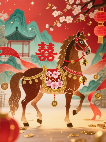 剪纸风马匹饰以“喜”字,融合撕纸与浮雕质感,中式古典建筑与梅花点缀,国潮轻拟物设计,营造浓厚喜庆氛围。
