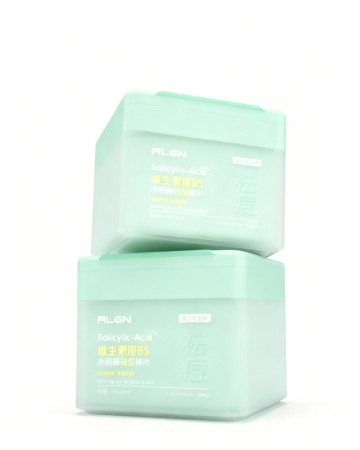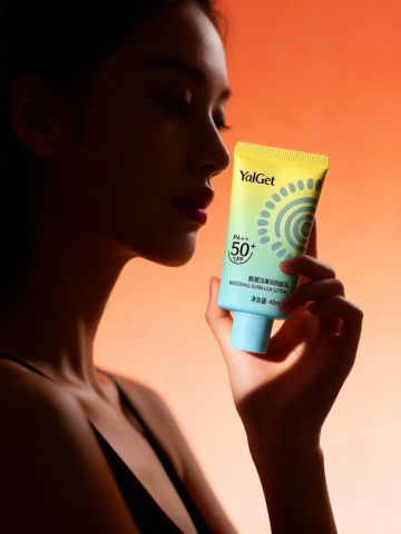 一张年轻女性手持护肤品、渐变紫色背景的美妆广告风格图片