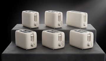 图片风格为「人像摄影」,场景是美式的开放式厨房,面包机在右侧前面、突出面包机,面包机放在桌子上,桌面采用白色大理石的桌面,左侧后面是米白沙发和白人女模特在看书的场景,右侧是厨房色的沙发,背景虚化模糊的效果。