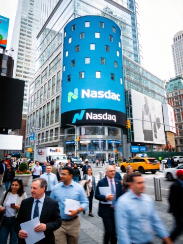 一个身着深色西装的商务人士站在由深蓝色立体方块构成的巨大向上箭头顶端,眺望远方的繁华城市全景,背景是明亮的蓝天白云,整体呈现出一种积极向上、充满希望的氛围。箭头的设计富有科技感和立体感,由许多小方块拼接而成,表面光滑,有光泽感。城市的建筑物密集而高耸,展现出现代都市的繁荣景象。
