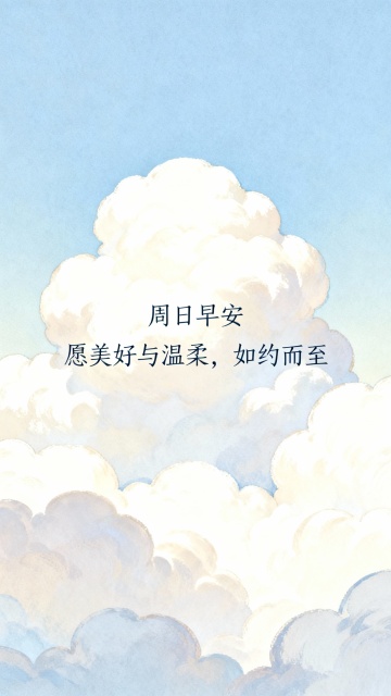 印象派风格天空,柔和的浅蓝色渐变背景,蓬松的白色云朵以松散的笔触和微妙的色彩变化呈现,阳光透过云层洒下温暖的光晕,整体画面营造出宁静而梦幻的氛围,具有莫奈作品中典型的光影流动感和色彩交融效果,笔触自由奔放,色彩明亮清新,给人以轻松愉悦的视觉感受。