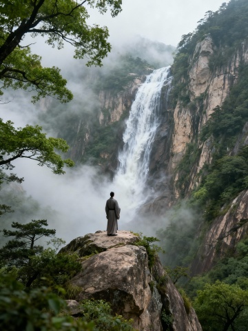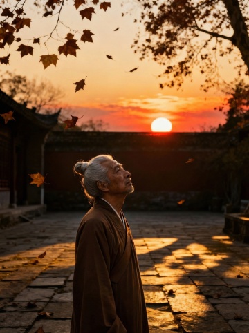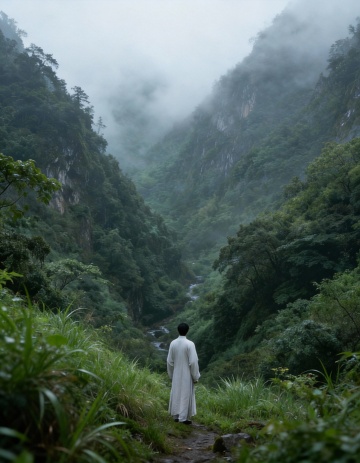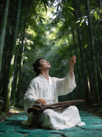 古典中式亭中,老者弹琴,水墨风格渲染,茶山云雾缭绕,意境深远。