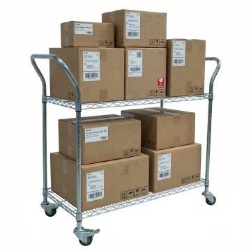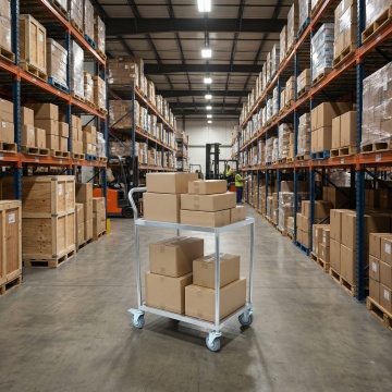 高写实主义摄影风格,现代物流仓库内部场景,不同样式的仓库布局设计,金属框架结构的高货架整齐排列,货架上堆满各种规格的棕色纸箱,部分纸箱印有不同品牌标识,地面为灰色水泥地,蓝色托盘承载货物,仓库顶部装有多排明亮的白色LED照明灯,光线均匀照亮整个空间,营造出高效、有序、专业的仓储氛围,画面具有清晰的纵深空间感,细节丰富,色彩以工业灰、金属蓝和纸箱棕为主色调,整体呈现出真实、严谨的纪实感。