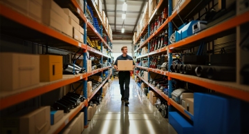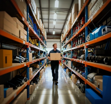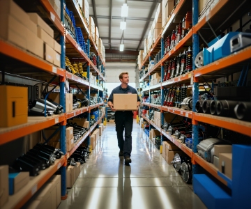写实风格的现代仓库内部,高亮度自然光与人工照明结合,光线均匀照亮整个空间,白色天花板搭配红色横梁,蓝色金属货架带有橙色层板和黄色警示底座,货架上整齐堆放着大量棕色纸箱,不同样式的仓库布局,可能包含不同高度的货架排列、部分区域的托盘堆叠方式变化或不同尺寸的储物单元,整体保持工业风的简洁与秩序感,色彩以蓝、橙、棕、白为主色调,地面为灰色水泥质感,空间通透,结构清晰,营造出高效、整洁的仓储氛围。