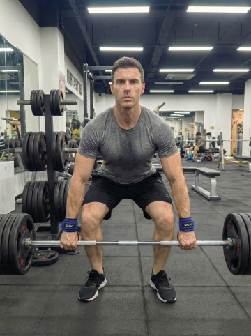 画面中心的外国白皮肤男性身着灰色运动背心、黑色紧身裤、运动鞋,身体呈深蹲姿态,双臂前伸维持平衡,正处于跳箱动作的蹲伏阶段。背景是典型健身房,墙面简洁、窗户透光明亮,地面铺有防滑垫,左侧可见健身环、器械架,右侧墙面有置物台,主体是木质跳箱(方形,表面有木纹,侧面设握把),地面排列着彩色壶铃(红、绿、紫等),传递出运动、活力、功能性训练的氛围。