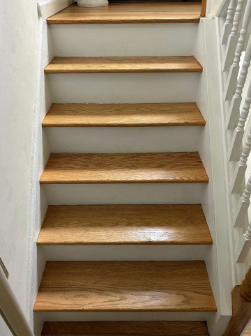 一个具有极简主义3D渲染风格的木制台阶,三阶结构,采用柔和的原木色调,表面呈现自然的木纹肌理和哑光质感。光线从左上方45度角照射,在台阶右侧形成清晰而柔和的灰色投影,阴影边缘有轻微的模糊过渡。整体构图居中对称,背景为纯白色,无其他装饰元素,台阶边缘线条干净利落,展现出简约现代的设计感,立体感强,材质细节真实,视觉上给人稳定、质朴且精致的感觉。