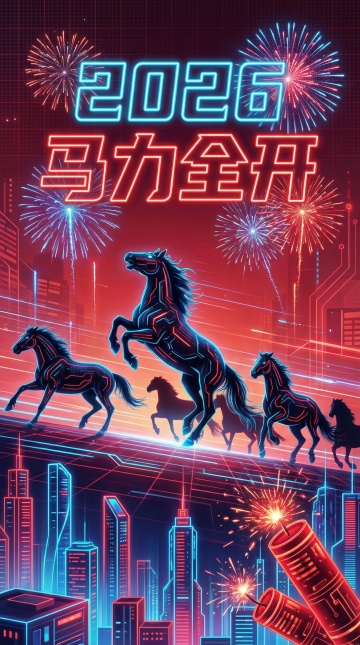 像素风拟人马形象,融合国潮元素与霓虹灯效果,喜庆热闹。卡通风格配色鲜艳,粒子特效点缀,展现2026马年大奖赛的狂欢氛围。