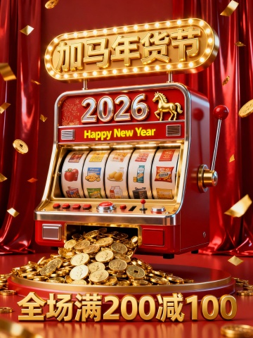 3D重拟物风格,鎏金金属质感,国潮风设计,喜庆红金配色,老虎机吐金币,满减促销信息突出,营造浓厚新年氛围。