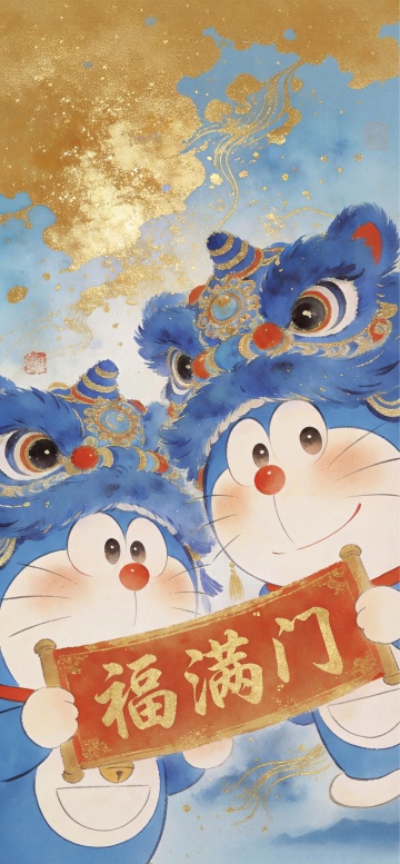 国潮风插画,拟人化小马手持“富”字,搭配红灯笼与春联,喜庆卡通感十足,传递新春祝福。
