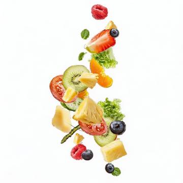 纯白色背景上,六个水果元素规整排布成系列素材集合,每个水果都以高度写实的摄影风格呈现,具有清晰的纹理细节、自然的光影过渡和高饱和度的色彩。左侧从上到下依次为:半个牛油果,果核完整,表面光滑的绿色果皮带有细密凸起,切开的果肉呈现淡黄绿色,一颗金黄色的蜂蜜滴落其上,蜂蜜具有透明的光泽和粘稠的质感;一个完整的蓝莓,深蓝色的表皮带有自然的果粉,顶部有细小的果蒂,球体饱满且富有弹性。右侧从上到下依次为:一个被切开的橙子,橙皮呈现鲜艳的橙黄色,带有明显的凹凸纹理,果肉瓣清晰可见,颗粒饱满,汁水欲滴;一个草莓,鲜红色的果实表面布满黄色的籽粒,顶部绿色的叶子呈现锯齿状,果实底部微微内凹;一个猕猴桃,被切成两半,棕色的果皮上覆盖着细密的绒毛,绿色的果肉中分布着黑色的籽粒,截面光滑;一个柠檬,一半被切开,黄色的果皮光滑且带有油点,果肉呈现淡黄色,白色的筋络清晰可见。所有水果元素保持统一的光照方向,阴影自然柔和,整体构图平衡对称,每个水果都占据相似的空间大小,共同营造出清新、健康的视觉氛围,具有强烈的设计感和信息传达效率,适合作为健康食品或饮品的宣传素材。