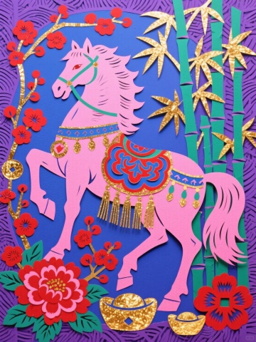 剪纸风与拼贴风融合,粉色骏马配金饰,竹梅环绕,国潮中式喜庆感十足,象征新年吉祥富贵。