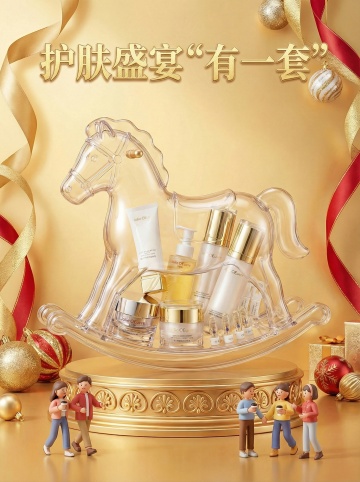 国潮风水彩背景,鎏金质感瓶身搭配中式灯笼挂饰,重拟物设计凸显奢华感,喜庆红金配色传递新年氛围。