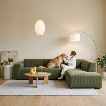 简约主义风格客厅,柔和灯光与绿绒沙发营造舒适温馨氛围,实景感十足,面料风质感细腻,传递宁静生活美学。
