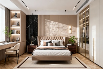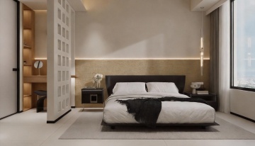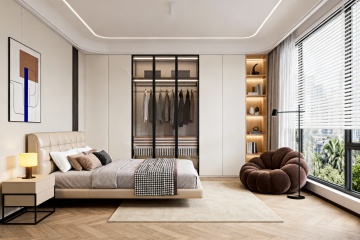 3D渲染的现代简约风格卧室,低饱和度墨绿色与暖灰色为主色调,柔和漫射自然光从右侧大面积落地窗洒入,木质地板温润有光泽,带有细微纹理。画面以床为视觉中心,床头采用浅灰色软包设计与深绿色墙面形成对比,床头两侧是黑色金属支架的玻璃台面床头柜,各放置一盏造型简约的白色球形台灯。床上铺着深绿色与灰色条纹的床单,搭配几个不同材质的灰色抱枕和一条米色针织毯随意搭在床尾。床尾正对着一面悬挂着抽象几何线条装饰画的墙,画框为黑色细边框。左侧墙面嵌入一整面墙的深灰色推拉门衣柜,衣柜底部设计有开放式展示格,摆放着几本精装书和一个小型绿植盆栽。右侧窗边设有一个浅灰色布艺单人沙发,沙发旁是一个原木色小圆几,上面放着一个白色陶瓷花瓶,里面插着几支干花。地面铺着一块浅灰色短绒地毯,地毯上随意散落着一本翻开的杂志和一个编织篮。整个空间光影层次丰富,阴影柔和,营造出宁静舒适且极具现代设计感的休憩氛围,视觉层级清晰,信息传达简洁高效,符合现代都市年轻人群的审美需求。
