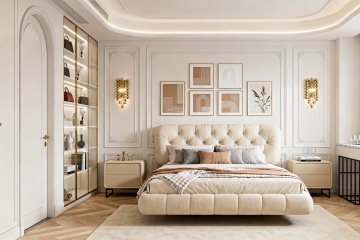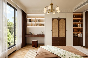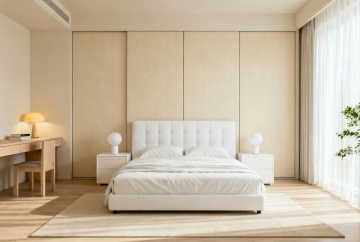 现代简约风格卧室,以米白色和浅木色为主色调,柔和的暖黄色间接光源(天花板灯带、床头壁灯)营造温馨宁静氛围。中央是一张铺着米白色床单和浅棕色针织毯的双人床,床头有两个白色靠枕和一个带褶皱装饰的抱枕。床的右侧是浅木色床头柜,上面放着一盏白色台灯和一本翻开的书。床尾铺着浅灰色地毯。左侧靠墙有一个浅木色开放式书架,摆放着绿植、装饰品和书籍,书架旁有一把浅色扶手椅和小圆几。背景墙挂着一幅花卉装饰画和两朵立体花瓣装饰。落地窗挂着米白色半透明窗帘,透进柔和自然光,整体空间明亮通透,布局对称平衡,材质上融合了布艺的柔软与木质的温润,细节精致,线条简洁流畅。