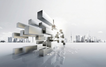 一个身着深色西装的商务人士站在由深蓝色立体方块构成的巨大向上箭头顶端,眺望远方的繁华城市全景,背景是明亮的蓝天白云,整体呈现出一种积极向上、充满希望的氛围。箭头的设计富有科技感和立体感,由许多小方块拼接而成,表面光滑,有光泽感。城市的建筑物密集而高耸,展现出现代都市的繁荣景象。