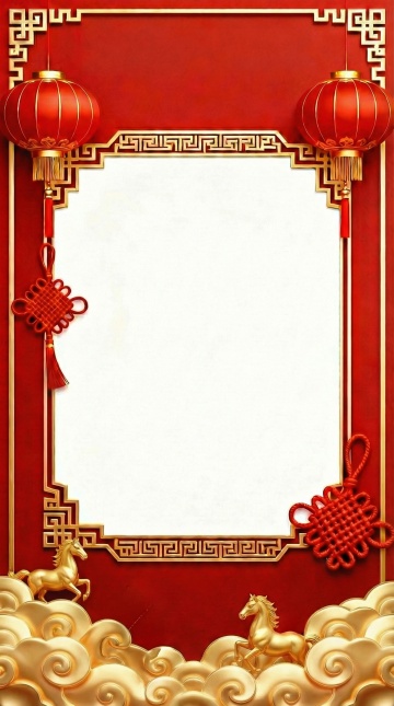 中式复古风海报,红金配色尽显喜庆与奢华,重拟物浮雕马踏祥云,搭配灯笼与中国结,国潮金属质感浓厚,节日氛围浓郁。