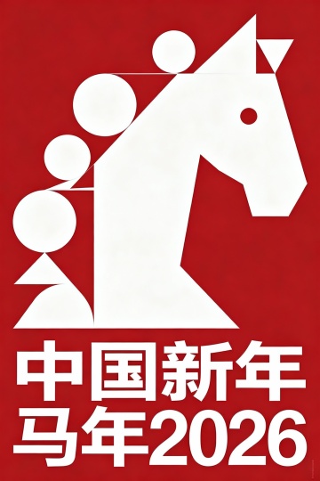 红白双色剪纸风设计,几何化马形融合传统元素,扁平风格传递喜庆中式感,象征2026年马年中国新年。