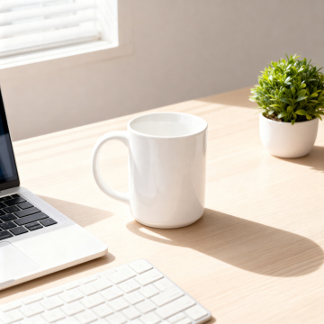 极简主义风格的桌面背景,采用柔和的莫兰迪色系配色,明亮的自然光从左侧照射,在桌面上形成清晰的光影层次,营造出宁静、专注且舒适的工作氛围。桌面中央偏下位置放置一个白色陶瓷咖啡杯,杯中盛有表面带有细腻奶泡的热饮,右侧有一支金属质感的钢笔斜放着,左上角是一个简洁的白色键盘,右上角则是一本摊开的浅灰色硬壳笔记本。桌面整体干净整洁,留有大面积的留白,可根据不同场景需求更换为原木色、浅灰色或淡蓝色等不同色调的桌面,摆设上可替换为绿植盆栽、简约台灯、无线耳机或不同风格的文具组合,保持整体构图的平衡感和视觉引导线,确保画面既简洁有序又富有生活气息和工作质感。