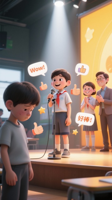 梦幻3D微缩艺术风,书本化身温馨教室,卡通人物沉浸学习,超现实夜景环绕。