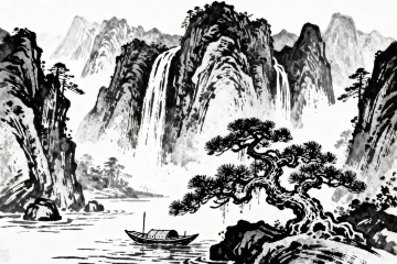 中式水墨插画,古典山水梦幻交织,金线勾勒路径,夕阳映衬诗意。
