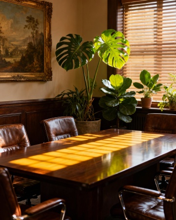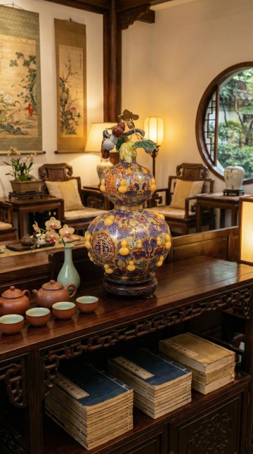 一张木纹桌面上,右侧放置着一个黑色镂空雕花屏风,屏风后有一盆绿色盆景,背景是柔和的暖黄色调,光线从左上角斜射过来,在粗糙质感的墙面上投下斑驳的光影,营造出宁静而古朴的氛围,环境变换为传统中式书房的角落,光线柔和温馨,整体风格统一且具有古典韵味。