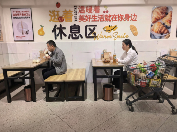 写实风格超市购物场景,两位女性朋友并肩行走的背影,金发女性穿着白色上衣和条纹阔腿裤,背着黄色双肩包,手持多个购物袋;黑发女性穿着白色上衣和橙色长裤,手持棕色手拿包和多个购物袋,两人手臂相挽,姿态亲密自然。超市内部宽敞明亮,顶部有现代感的弧形设计和嵌入式灯光,地面光滑反光,背景中可见货架、商品和模糊的其他顾客,整体色调以暖黄色和白色为主,光线柔和,营造出轻松愉快的购物氛围,视觉层次分明,主体人物突出,背景细节丰富,符合购物场景的真实感和生活气息。