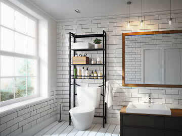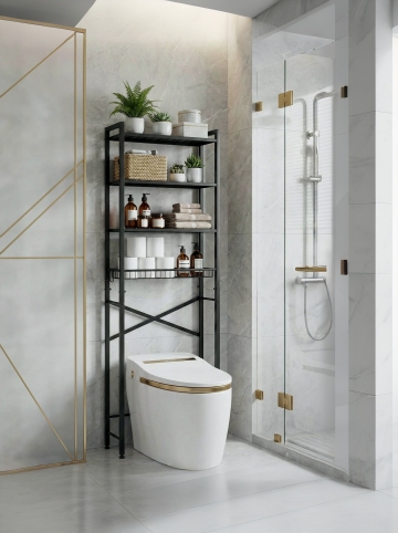 极简主义风格卫生间,米白色调墙面与地面,柔和自然光,高光细腻的白色马桶,嵌入式米白色浴室柜配大理石台面,上方带LED灯的长条形镜面柜,壁挂式黑色金属毛巾架挂着白色毛巾,左侧透明玻璃淋浴房,柜内及台面摆放洗护用品,整洁有序的空间布局,简约现代的设计感,不同场景下的卫生间内部摆设,强调空间的通透感与收纳功能,干净利落的线条,舒适明亮的氛围