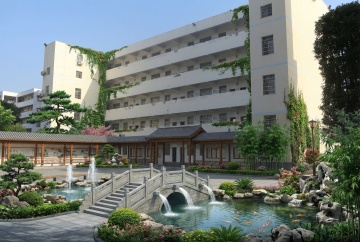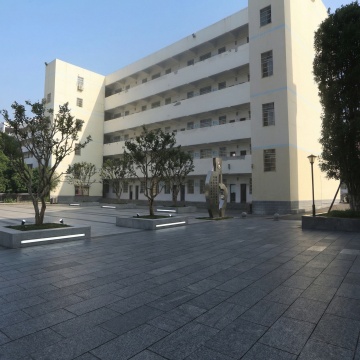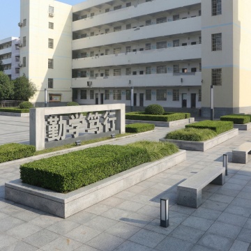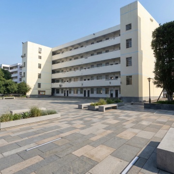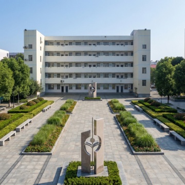 中景仰拍视角,现代风格校园建筑群沐浴在清晨金色阳光中,主体为红砖钟楼式教学楼主楼与红砖连廊式教学楼组合,左侧配银灰色金属质感实验楼,白色校门位于中央广场,门前有几何形绿化带、成排梧桐树及石板道路,天空湛蓝点缀絮状白云,阳光透过树叶形成斑驳光影,地面有黄色校车、骑行学生及步行师生,钟楼顶部时钟指向8:00,教学楼玻璃幕墙反射着天空与树木,建筑细节包括红砖砌法纹理、金属窗框线条和浮雕校徽,色彩以砖红色与灰白色为主调,点缀绿色植物,构图采用三分法,前景有晨读学生剪影,中景建筑群形成明确透视,背景是城市天际线,整体呈现明快而庄重的学术氛围,写实主义风格,空间纵深感强烈。