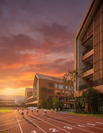 广角俯拍视角,现代化中学体育场的黄昏全景,深红色塑胶跑道在夕阳下泛着温暖光泽,六道白色分道线如钢琴键般延伸至画面深处,弯道处有几个穿着蓝白校服的学生正在进行变速跑训练,他们的影子被拉得很长。跑道内侧是修剪整齐的深绿色人工草坪,几名女生正围坐成圈进行拉伸运动。左侧的灰色看台坐满了观看校际足球赛的学生,他们挥动着蓝白相间的校旗,遮阳棚的金属结构在暮色中投下几何形状的阴影。背景中五层米色教学楼的窗户透出温暖的灯光,与远处渐变成粉紫色的天空形成柔美过渡,几棵高大的梧桐树在微风中摇曳,将斑驳的影子投射在跑道上。空气中弥漫着青草和塑胶的混合气味,远处传来操场广播里播放的轻音乐和学生们的欢呼声,整体色调从橙红向靛蓝渐变,营造出既充满运动活力又带着青春黄昏特有的温馨氛围。