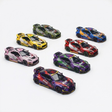 6个不同配色、不同样式、不同材质的卡通风格汽车造型,保持黄色主车的圆润线条、黑色细轮廓、简化车窗和车轮设计,每个车拥有独特鲜艳色彩(如红色、蓝色、绿色、紫色、橙色、粉色)、差异化车身细节(如不同车灯形状、车门线条、车顶样式)和材质质感(如金属光泽、哑光漆面、磨砂质感、光滑塑料感、珠光效果、卡通木纹),排列成上下两行各三辆对齐布局,背景为纯净浅色,整体保持简洁明快的儿童插画风格,色彩鲜明和谐,无文字元素。