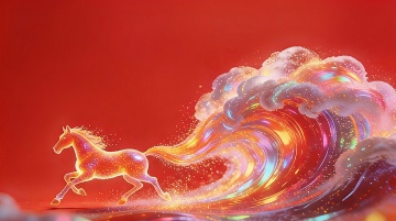 鎏金粒子勾勒奔腾骏马,红金交织的梦幻光影中,插画风呈现奢华喜庆的虚拟自然之美。