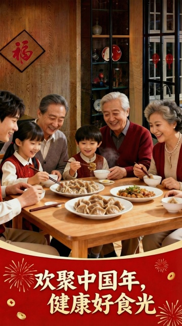 国潮风融合剪纸与鎏金元素,大字风标题醒目喜庆,实景中式庭院中三代同堂围桌贺春,红金配色尽显年味吉祥。