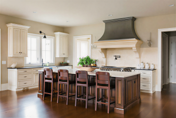 一个明亮整洁的现代厨房,采用简约优雅的设计风格,以白色为主色调,搭配黄铜色金属装饰细节。厨房整体呈现出温馨舒适的氛围,阳光透过百叶窗洒入,在白色橱柜和大理石台面上形成柔和的光影效果。白色的橱柜带有黄铜色的圆形拉手,上方的吊柜和下方的地柜组合提供了充足的储物空间。大理石台面光滑洁净,带有自然的灰色纹理。台面上有一个双槽不锈钢水槽,搭配黄铜色的水龙头。水槽旁边的金属桶里插着木质的锅铲和汤勺。墙面安装着黄铜色的挂杆,上面挂着各种木质和金属材质的厨房用具,包括勺子、铲子等。挂杆上方的白色搁板上摆放着不锈钢和玻璃材质的储物罐,里面装着各种香料和食材。台面上还摆放着一个白色的盘子,里面放着几块叠在一起的三明治,旁边还有一盘色彩鲜艳的沙拉。整体构图采用了三分法,光线从左侧窗户进入,营造出明亮通透的感觉,细节丰富,质感细腻,展现出干净利落的现代厨房设计感。