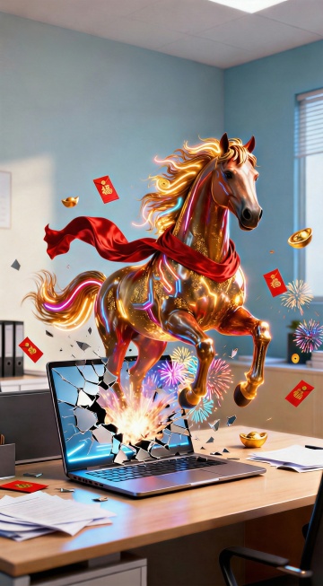 卡通感插画风,拟人化马形象演绎职场反差,漫画式夸张表达KPI压力与爆金班喜悦,粒子特效强化金钱雨氛围,融合新年祝福,趣味传达2026职场好运愿景。