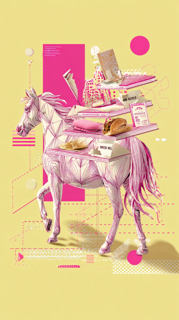 低多边形风格的拟人化马匹,搭载多层餐车,融合孟菲斯几何元素与潮流拼贴,粉色线条勾勒梦幻未来感,充满趣味与抽象体积感。