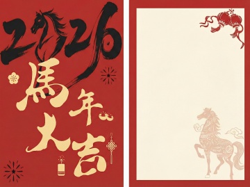鎏金剪影马首与书法“福”字融合,国潮风韵十足,红金配色尽显喜庆中式感,大字风设计彰显2026马年鸿运。